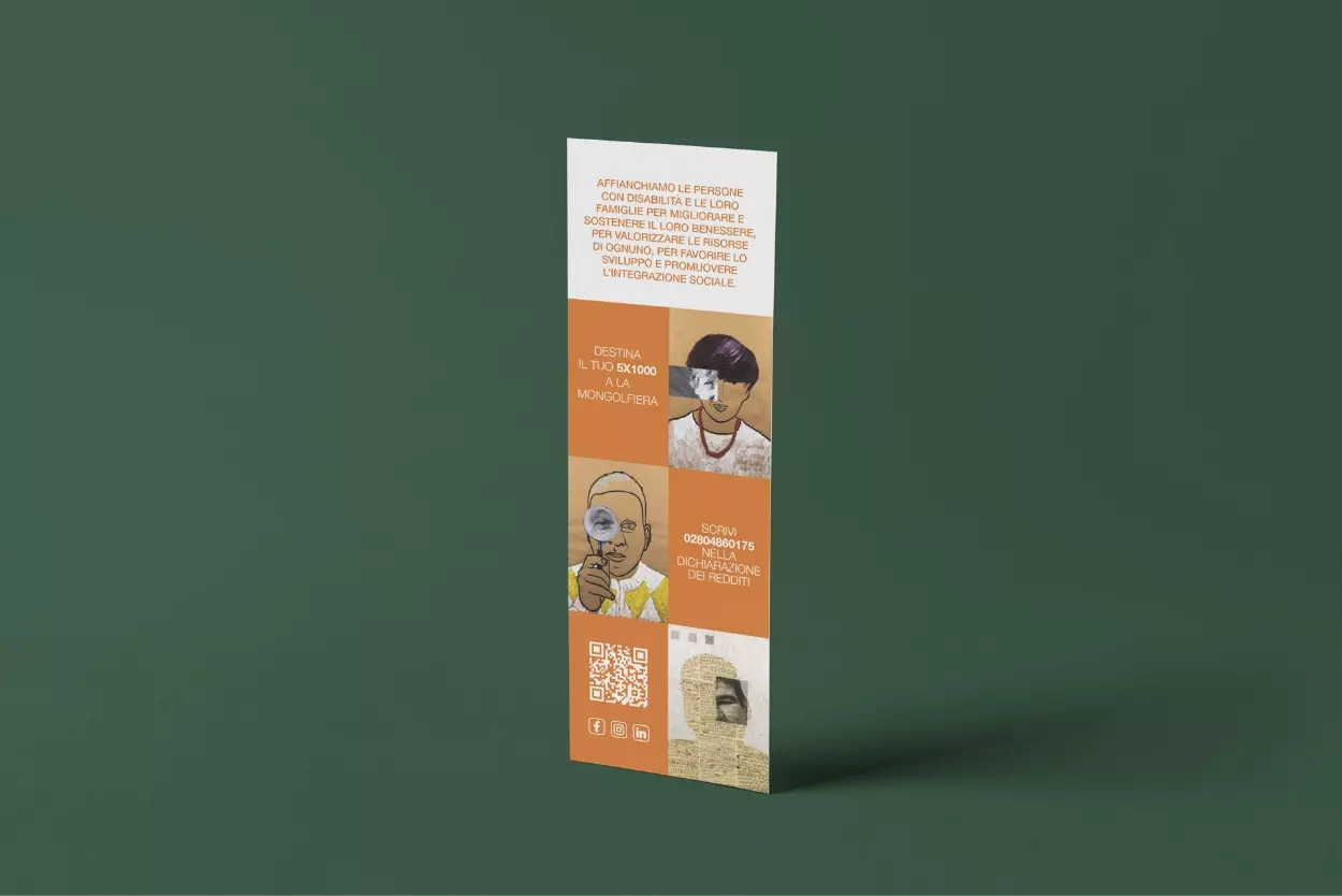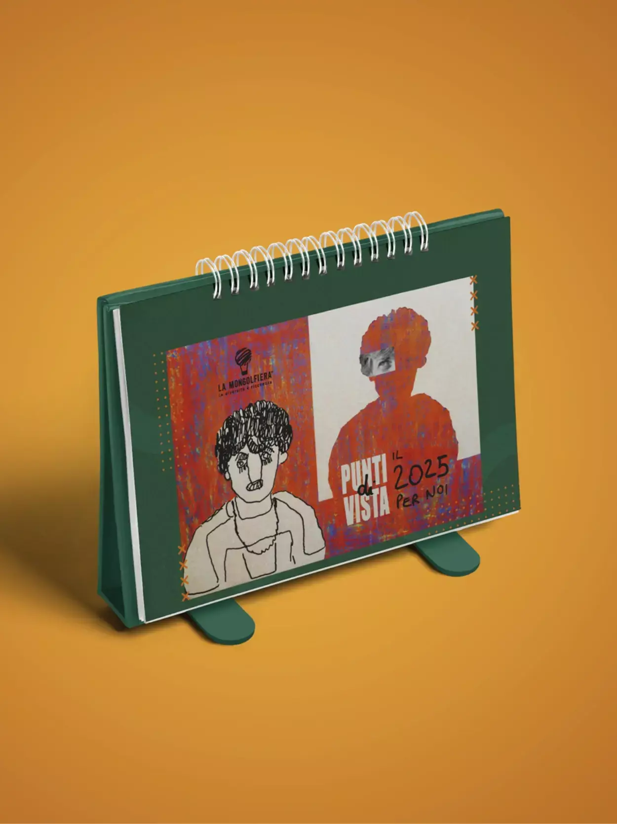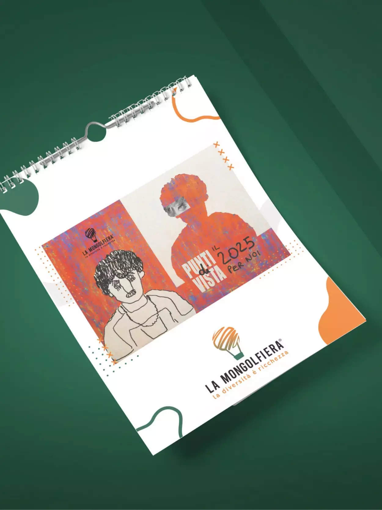 Calendari, brochure, segnalibri e tutti i materiali cartacei sono stati progettati seguendo un filo conduttore visivo e concettuale ben preciso: un sistema grafico codificato, che riprende i colori istituzionali della cooperativa — arancio, verde e bianco — e che riflette il processo interno de La Mongolfiera, fatto di inclusione, connessione e partecipazione. Proprio per questo motivo abbiamo scelto un approccio corale: le illustrazioni e le fotografie sono state realizzate direttamente dagli utenti dei servizi della cooperativa, diventando parte integrante e rappresentativa del progetto.