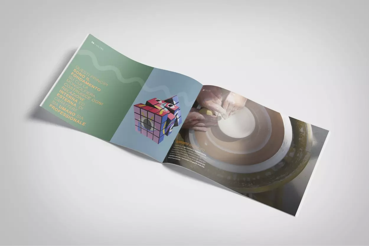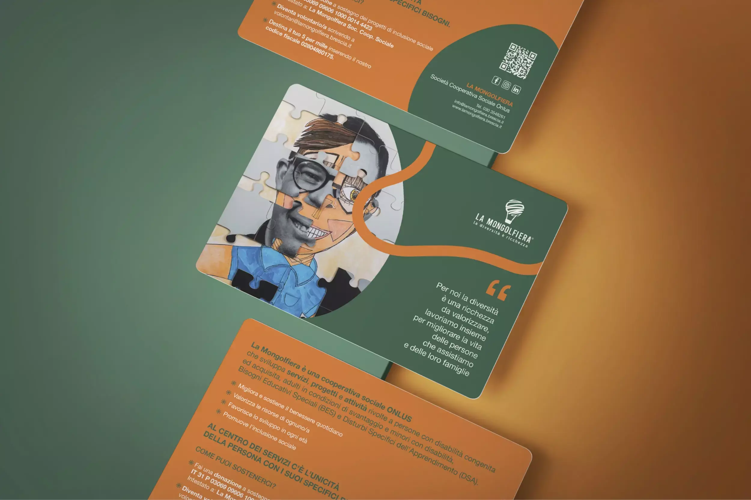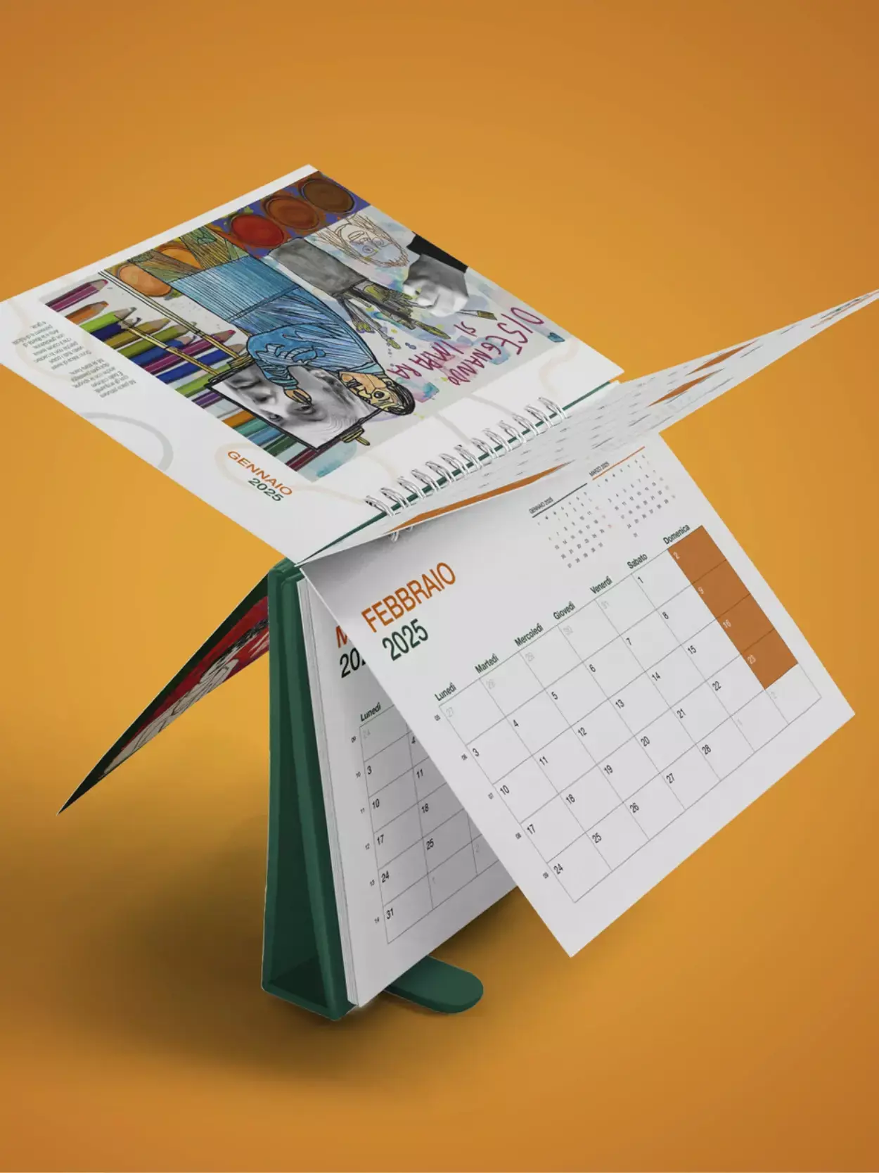 Calendari, brochure, segnalibri e tutti i materiali cartacei sono stati progettati seguendo un filo conduttore visivo e concettuale ben preciso: un sistema grafico codificato, che riprende i colori istituzionali della cooperativa — arancio, verde e bianco — e che riflette il processo interno de La Mongolfiera, fatto di inclusione, connessione e partecipazione. Proprio per questo motivo abbiamo scelto un approccio corale: le illustrazioni e le fotografie sono state realizzate direttamente dagli utenti dei servizi della cooperativa, diventando parte integrante e rappresentativa del progetto.